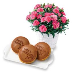 お母さんに「ありがとう」を伝えるられるメッセージ入りどら焼きと、人気のカーネーション「ホットハート」のセットです。