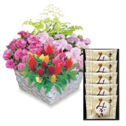 昨年人気NO.1の”花と観葉植物が楽しめる”寄せ鉢「マザーズバスケット」と個包装の栗入りどら焼き(5個入)をセットしました。