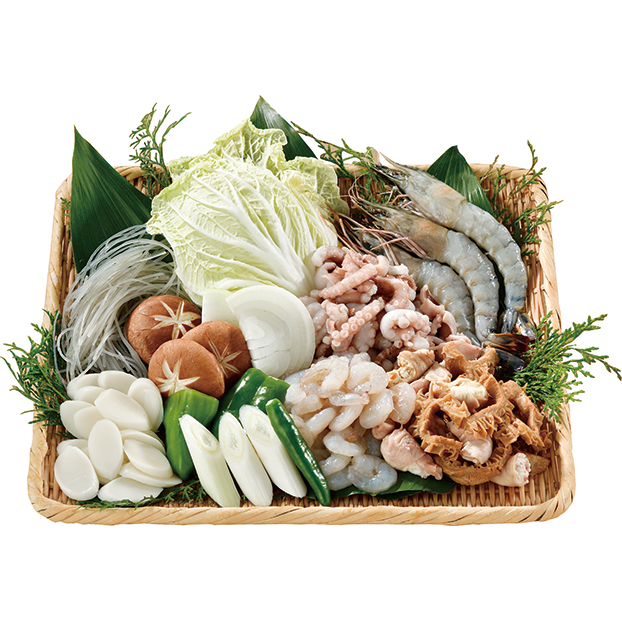 もつ200g、ハチノス200g、ボイルエビ190g、エビ180g、タコ180g、春雨140g、餅100g、はくさい、ネギ、しいたけ、ニラ、ストレートスープ