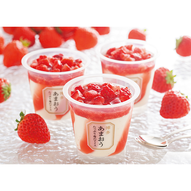 いちごの王様、博多あまおうのソースが入ったアイスの上に、ごろっと果肉をのせた、旬の味と素材感をたっぷり楽しめる、まさにいちご尽くしのアイスです。