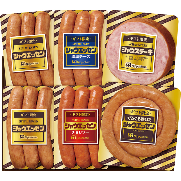(ギフト限定)シャウエッセン100g×2、シャウエッセン濃厚チーズ100g、シャウエッセンチョリソー100g、ぐるぐる巻いたシャウエッセン122g、シャウステーキ122g