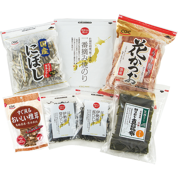 一番摘み焼のり板のり10枚、国産にぼし150g、 花かつお70g、 芽ひじき24g、 長ひじき24g、荒磯だより切りだし真昆布(北海道産)一等検60g、すぐ戻るおいしい椎茸20g (段ボール箱入り)