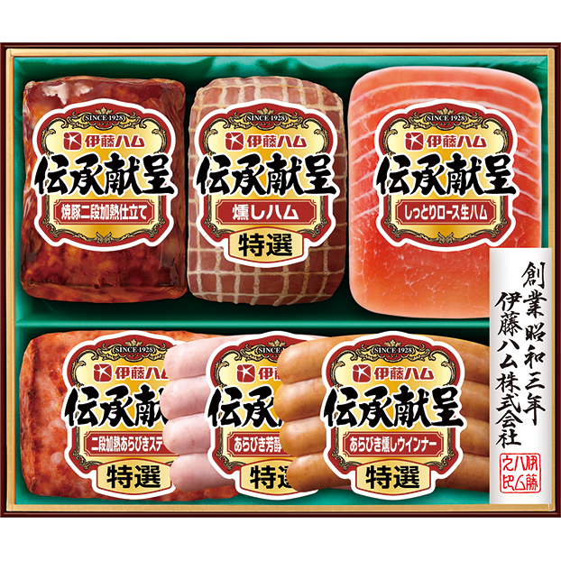 焼豚二段加熱仕立て160g、特選燻しハム180g、しっとりロース生ハム45g、特選二段加熱あらびきステーキ110g、特選あらびき燻しウインナー80g、特選あらびき芳醇ウインナー80g