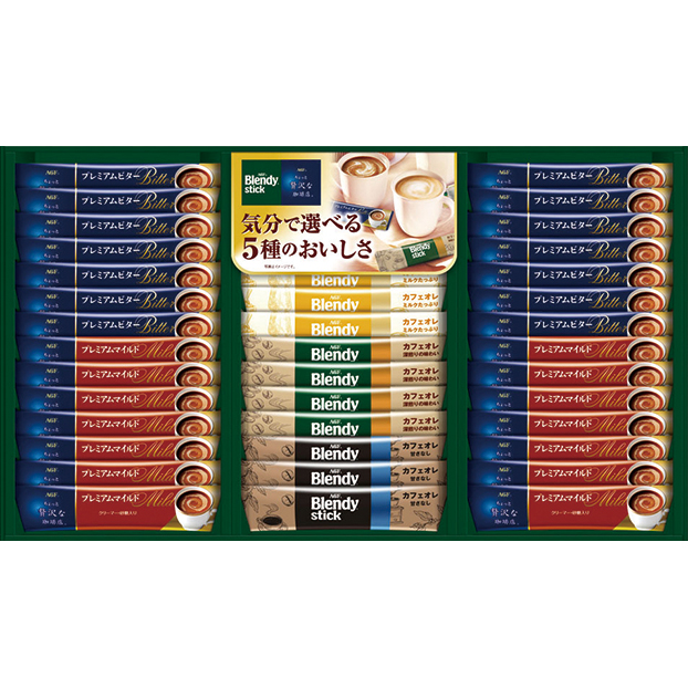 ブレンディスティックカフェオレ14g×4、ブレンディスティックカフェオレ(ミルクたっぷり14g・甘さなし11.4g)×各3、ちょっと贅沢な珈琲店スティックコーヒー(プレミアムビター・プレミアムマイルド)各7g×各14