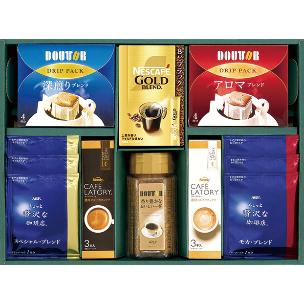 カフェラトリー(濃厚ミルク10.5g・濃厚ビター9g)×各3、ちょっと贅沢な珈琲店ドリップパック(スペシャルブレンド・モカブレンド)各7g×各3、ドトールドリップパック(深煎りブレンド・アロマブレンド)各7g×各4、ネスカフェゴールドブレンドスティックブラック2g×8、ドトールコーヒー香り豊かなおいしい一杯60g