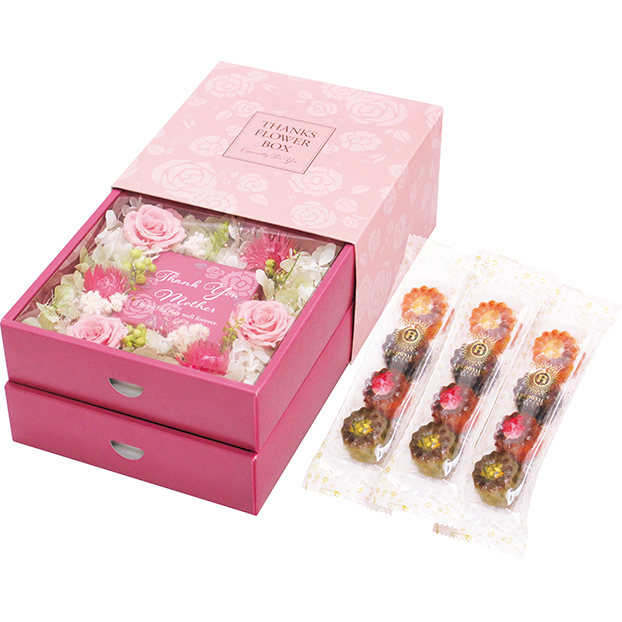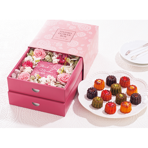フレンチの人気店「レ ロジェ エギュスキロール」の一つ一つ丁寧にトッピングした4種のミニカヌレと華やかなプリザーブドフラワーボックスをセットにしました。
